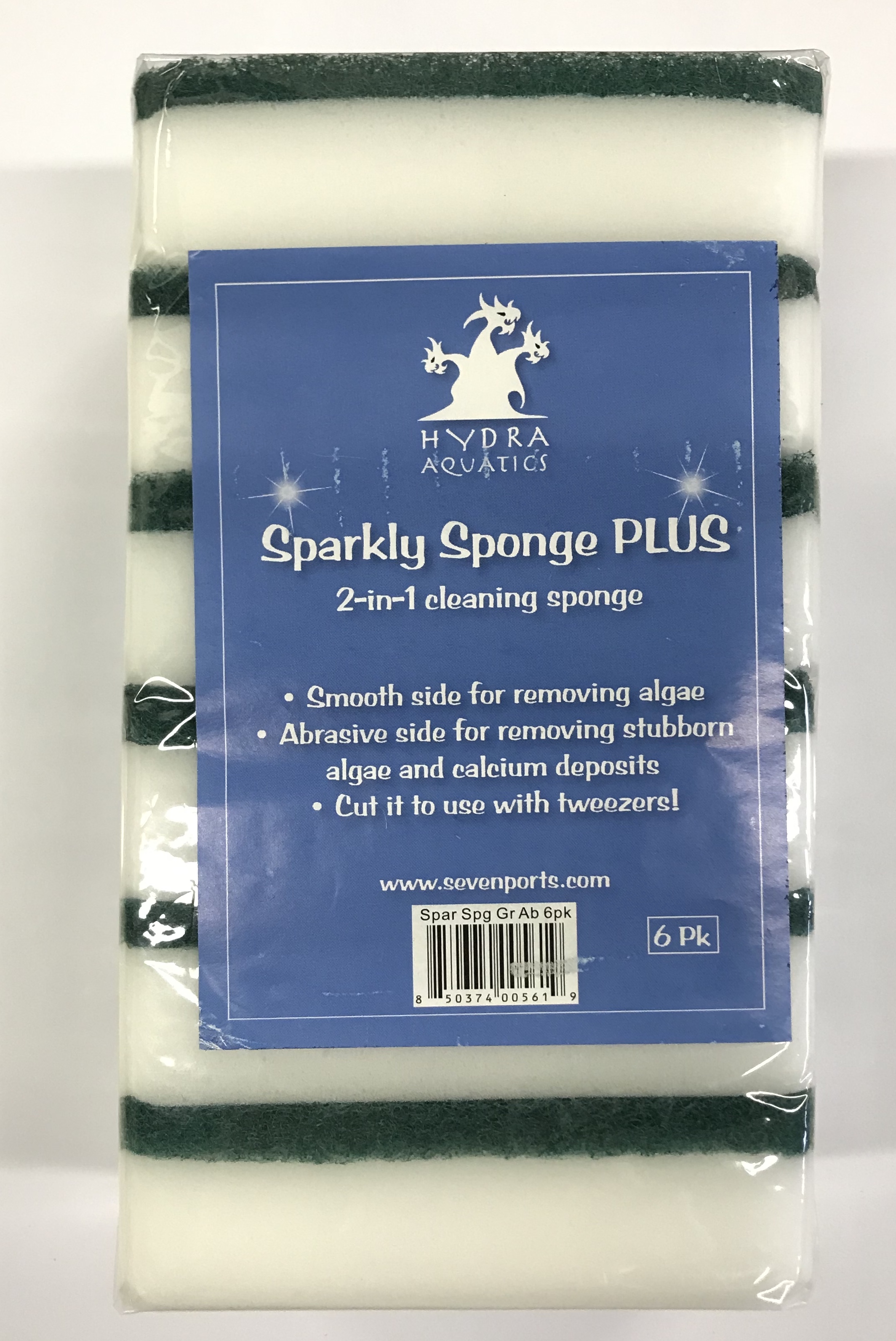 Hydra Aquatics� Sparkly Sponge PLUS 2-in-1 Cleaning sponge has the same great feature as the original Sparkly Sponge with a smooth side for removing algae, but also has an added benefit of an abrasive side for removing stubborn algae and calcium deposits. You can cut it and use it with tweezers to get to the smaller places in your tank.