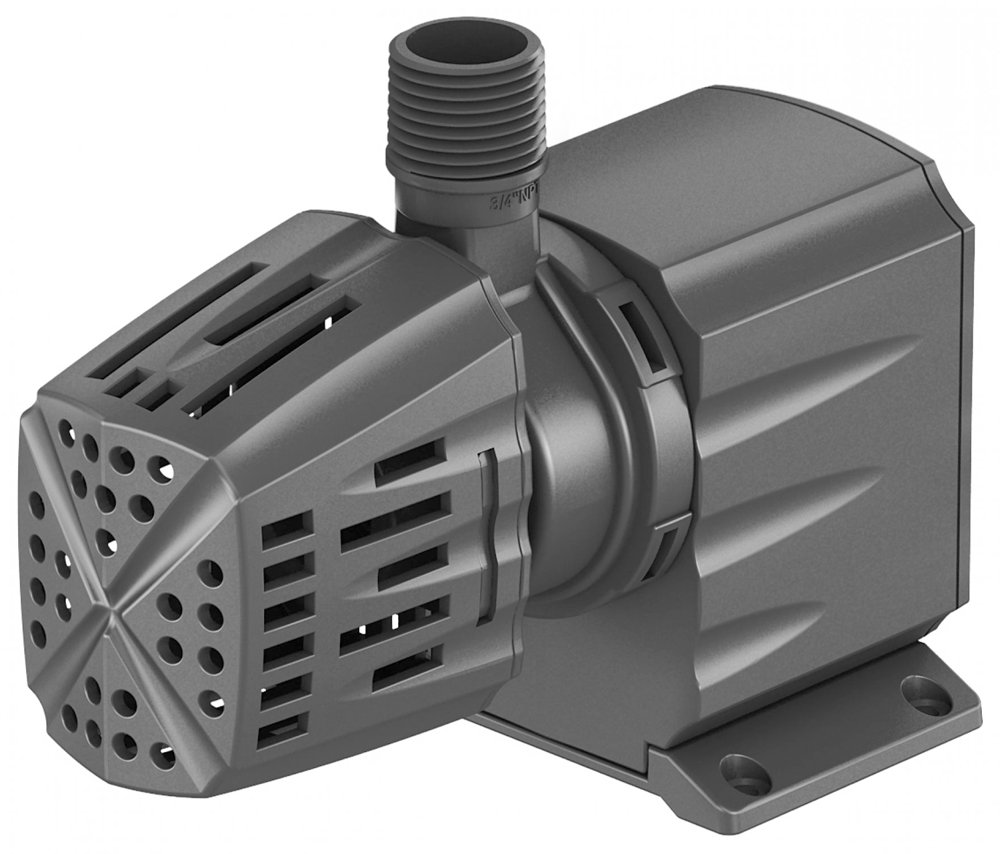� Magnetic Induction pumps provide years of service in the demanding conditions of smaller ponds, waterfalls and fountains. � Atlantic MD-Series pumps feature better flows at higher heads, a longer warranty, and are easier to service. � Male threads on both inlet and outlet are less restrictive for higher flow. � Volute rotates to accommodate any pump orientation. � A quarter-turn of the volute accesses the impeller assemble for easy periodic cleaning. � Oversized ceramic shaft resists wear better than steel, for longer service life. � Impeller assembly replaces quickly and easily to keep pump running for years. � Large, stable base for anchoring pumps may be removed in tight applications. � Removable pre filter provides integrated filtration, reduces internal wear and extends impeller life. � Included outlet fittings are tapered to fit a wide array of tubing types and sizes. � 1000-1500 gph models include 1/2 inch adapters for use with Triton Check Valve and Fountain Plumbing kits.