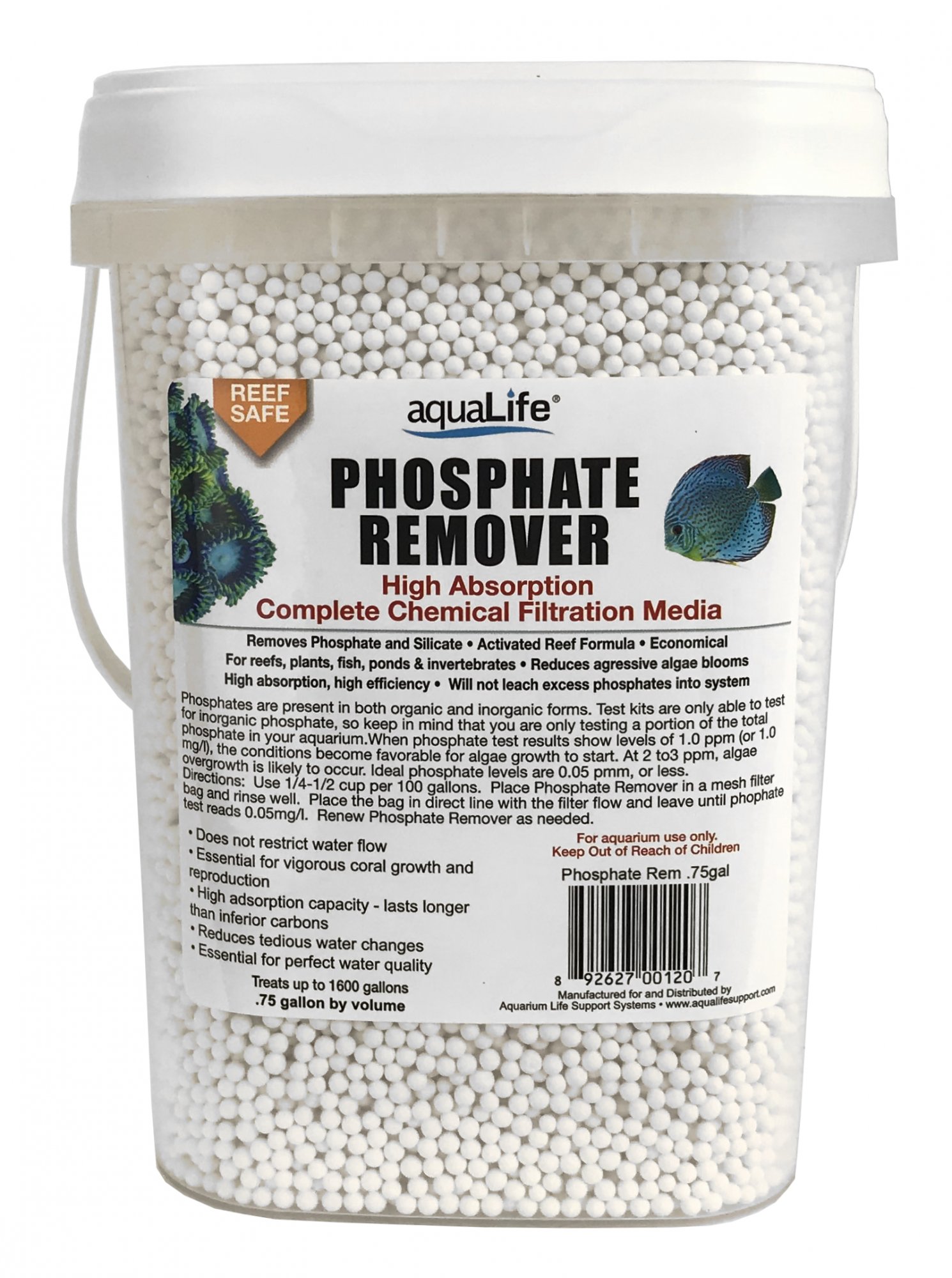 AquaLife Phosphate Remover is great for refills programs and shop use. This phosphate remover will perform better than competing products and is economical to use. It is reef safe and good for freshwater or saltwater applications. The tremendous bead design has superior flow characteristics. It does not release phosphate or silicate back into the water.