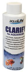 Cloudy water will never be a problem again! Enjoy a crystal clear aquarium with AquaLife CLARIFY for Aquariums. Suspended particles that are too fine to be removed by mechanical filtration cause water to appear cloudy. Whether resulting from overfeeding, a bloom of bacteria, or gravel dust, cloudy water can become clear water in minutes with AquaLife CLARIFY for Aquariums.